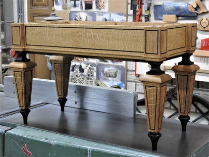 Dit prachtige bankje is met de hand vervaardigd naar eigen ontwerp uit Slavonisch eikenhout met wengé inlegwerk. Het meubelstuk heeft een verborgen lade en word afgewerkt met een lederen zitting naar keuze. Het hout is behandeld met een natuurlijke plantaardige olie.